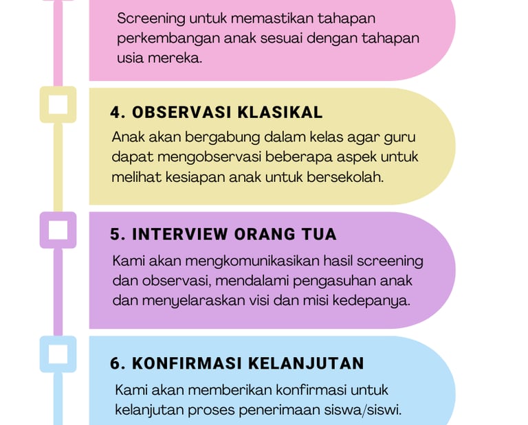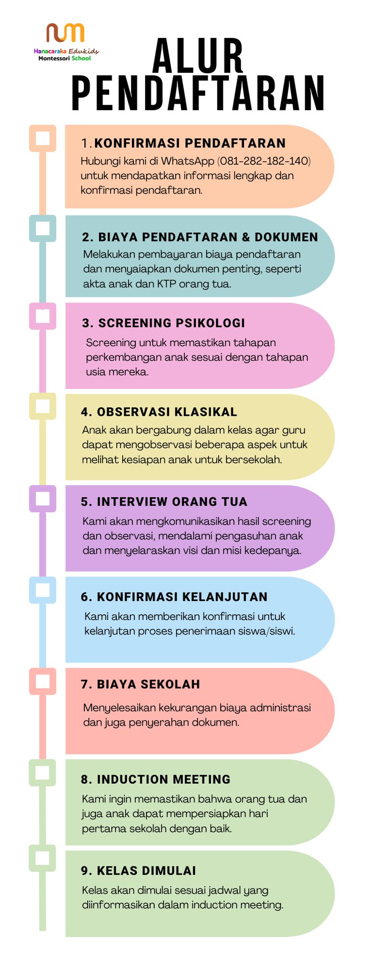 Di Hanacaraka Montessori, proses penerimaan siswa baru dirancang untuk memastikan bahwa anak-anak dan keluarga mereka menemukan lingkungan belajar yang sesuai dan mendukung. Proses ini terdiri dari beberapa langkah penting untuk mengenal calon siswa dan memastikan kesiapan mereka memasuki tahap awal pendidikan.